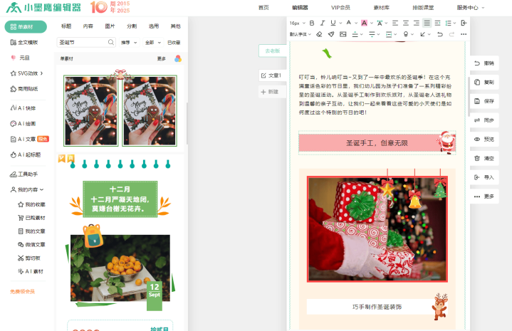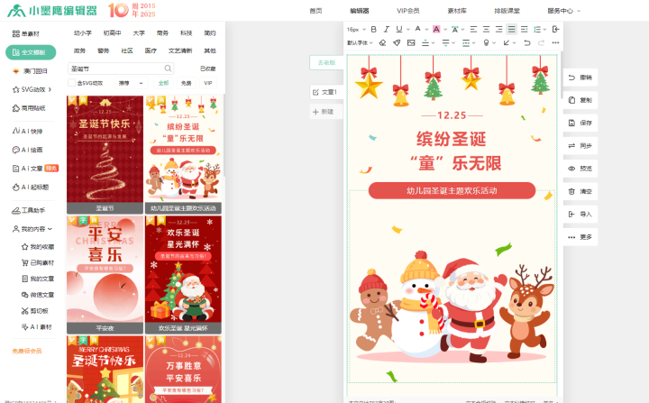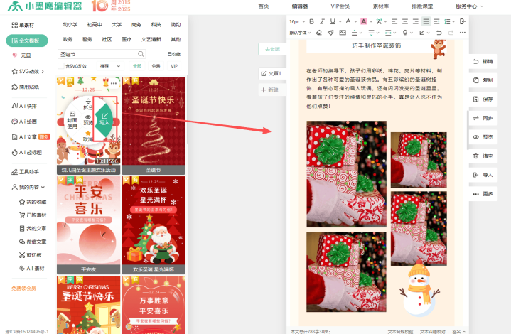 首先你得知道,节日排版最忌讳的就是自己瞎琢磨。你不是专业设计师,没必要研究雪花该飘在左边还是右边,红色背景配什么颜色的字好看。小墨鹰编辑器里准备好了现成的“圣诞套装”,就像你买搭配好的服装,直接穿上就好看。