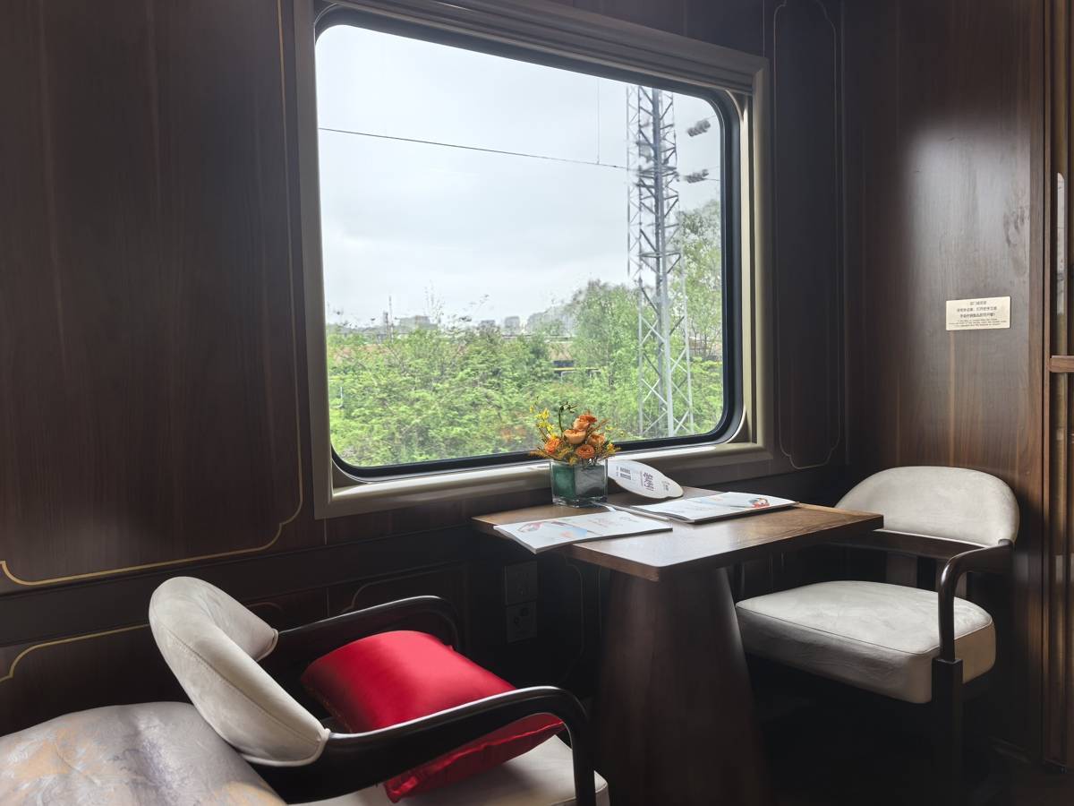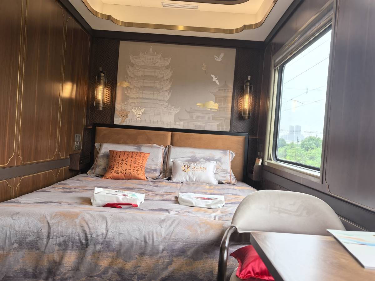 与传统列车不同,该车专为旅游定制,主打舒适慢游。全车仅设231个席位,提供大床房、双人间、三人间及四人间。所有房间均配有独立观景窗、干湿分离卫浴、安全扶手及SOS紧急呼叫按钮。车厢内中式风格温馨整洁。餐饮、医护、活动、导览、管家等团队全程随行,可提供定制营养餐、非遗手作体验、24小时健康保障等特色服务。